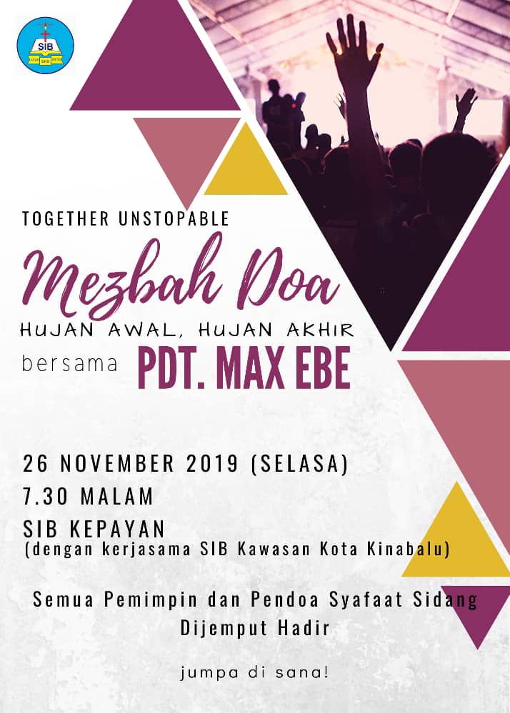 MEZBAH DOA BERSAMA PDT. MAX BEE – Hujan Awal, Hujan Akhir – di SIB Kepayan 26 Nov, 2019 Jam 7.30 pm Posted by@ dr jonathanNovember 14, 2019November 15, 2019Posted inUncategorized Discover more from SIB Donggongon Subscribe to get the latest posts sent to your email. Type your email… Subscribe Share this:Share Share on WhatsApp (Opens in new window) WhatsApp Share on X (Opens in new window) X Print (Opens in new window) Print Share on Facebook (Opens in new window) Facebook Email a link to a friend (Opens in new window) Email Share on LinkedIn (Opens in new window) LinkedIn Like Loading... Related Published by @ dr jonathan Sebuah gereja Kristian Injili dan Karismatik. View more posts